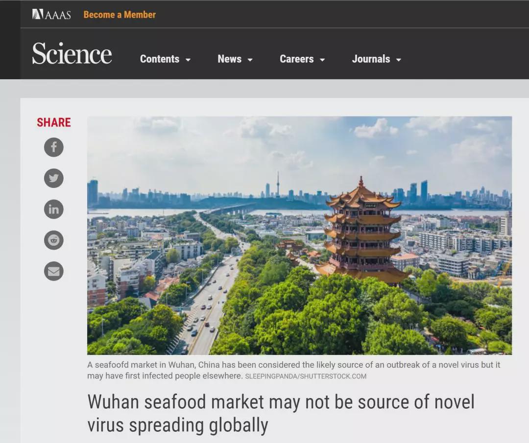 在新型冠状病毒的起源地的讨论上,《科学》杂志以《武汉海鲜市场可能并非新型冠状病毒发源地》(Wuhan seafood market may not be source of novel virus spreading globally)为题的报道指出,有学者认为,发表在最新《柳叶刀》上的论文就挑战了这一存在已久的基本认识——武汉华南海鲜市场是病毒发源地。