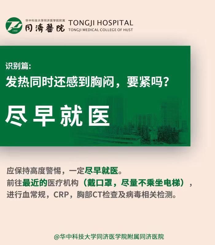 答:最好步行至最近的医疗机构(戴口罩,尽量不乘坐电梯),进行血常规,CRP,胸部CT 检查及病毒相关检测,对于出现发热伴有胸闷不适的患者,应保持高度警惕,一定尽早就医。(易科)