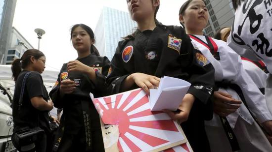 韩国民众在街头抗议日本的经济制裁。
