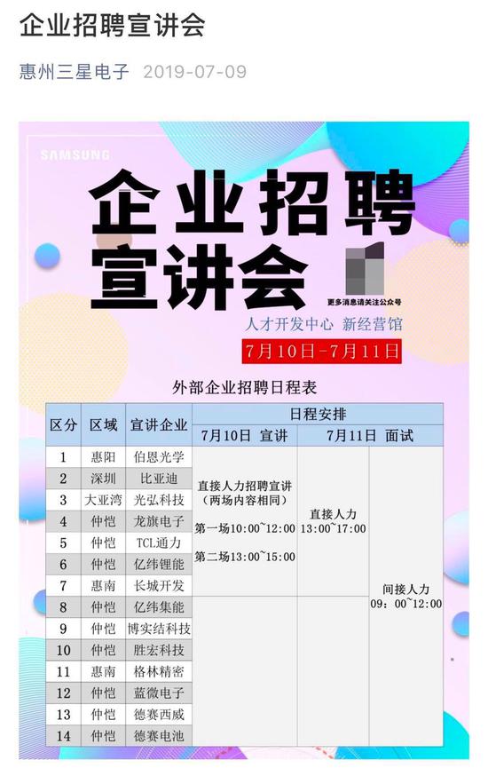 7月9日,惠州三星电子罕见地在其官方公众号上发布了一则《企业招聘宣讲会》通告,宣布从7月10日开始,比亚迪、TCL通力、伯恩光学等科技企业将会进厂举行招聘宣讲会。这意味着,惠州三星已经开始为员工找下家了。