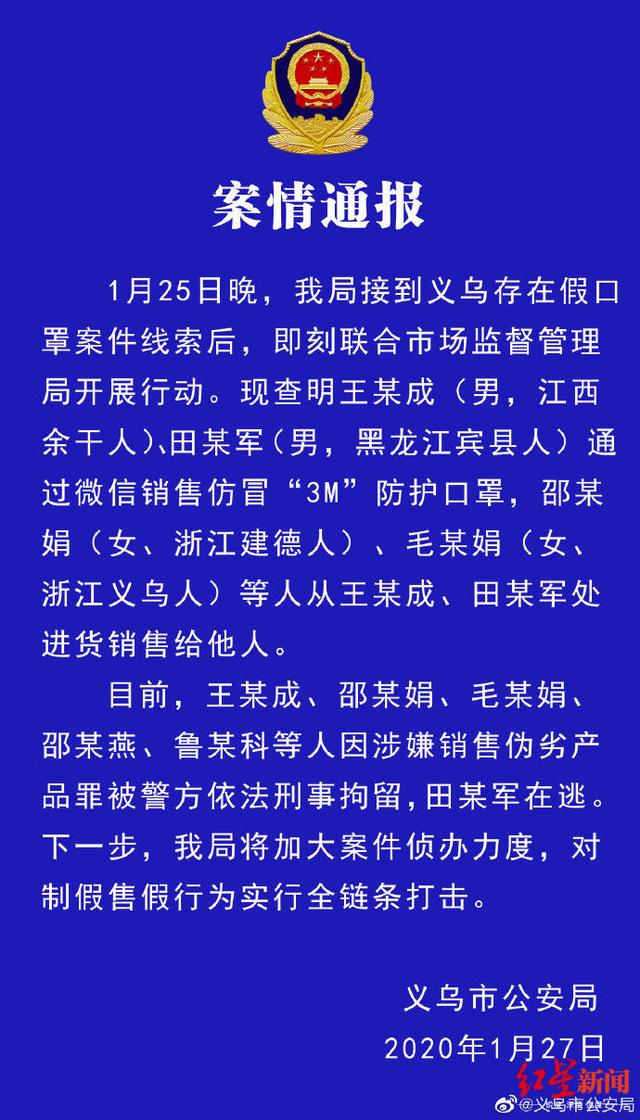 1月29日,有媒体报道,近日,有网友举报称,浙江义乌有一商家在销售仿冒3M防护口罩,涉案假冒口罩数量高达700万只。