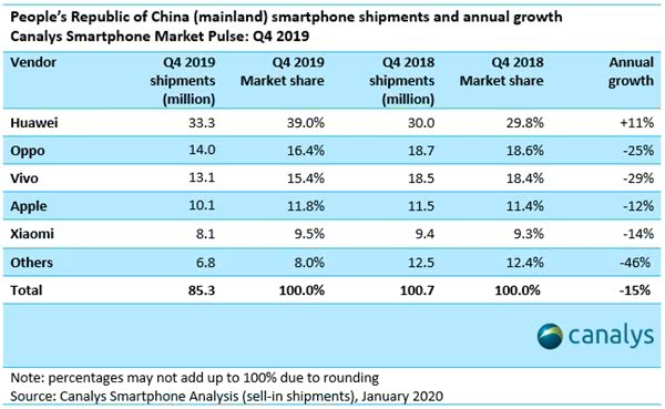 市场调研机构Canalys给出的报告显示,2019年华为以38.5%的市场份额继续稳坐中国智能手机市场头把交椅。华为之后,第2到第5名分别是:OPPO(17.8%)、vivo(17.0%)、小米(10.5%)、苹果(7.5%)。以上五大智能手机厂商垄断了超过九成的市场份额,其他智能手机品牌的市场份额被极度压缩,加起来才占比8.7%。