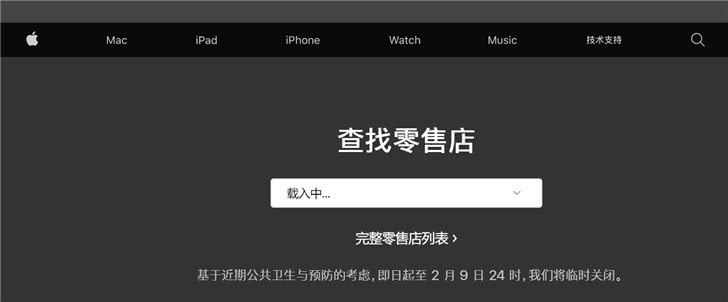2月1日消息,苹果中国官网现已发布公告称,基于近期公共卫生与预防的考虑,即日起至2月9日24时,Apple Store零售店将临时关闭。