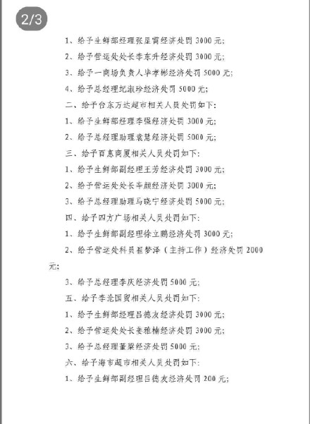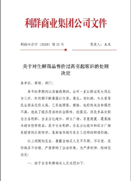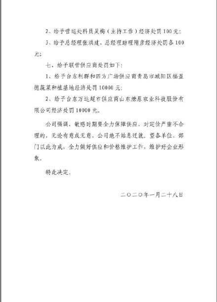 随后,该公司发出的“利上司企字【2020】72号”文件显示,利群集团给18名员工和负责人开出了200元到5000元不等的处罚,并对台东利群和四方广场供应商青岛市城阳区福盈德蔬菜种植基地经济处罚10000元,对台东万达超市供应商山东燎原农业科技股份有限公司经济处罚10000元。