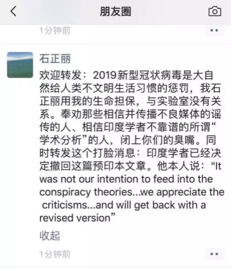 对此,2月2日下午,中国科学院武汉病毒所研究员石正丽在朋友圈说:“2019新型冠状病毒是大自然给人类不文明生活习惯的惩罚,我石正丽用我的生命担保,和实验室没有关系。”
