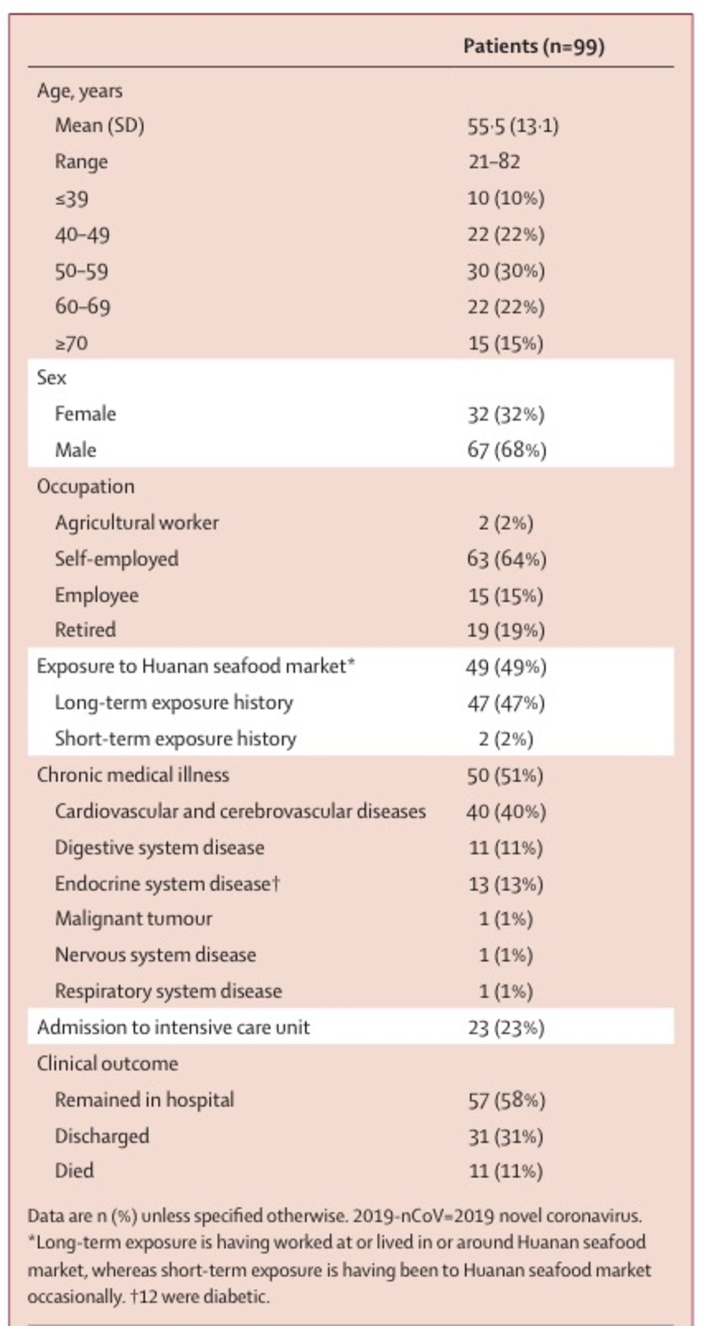 新的论文表明,患者均为今年 1 月 1 日至 1 月 20 日之间在武汉金银潭医院接受治疗的确诊患者。作者将临床记录,实验室结果和影像学发现与流行病学数据相结合。发现大多数患者是中年人(平均年龄55.5岁),男性(67例患者),大约占比为 49% 的患者有过接触华南海鲜市场的历史(49例患者),其中大部分(46例患者)在华南海鲜市场工作,职位为经理或销售人员,相比之下,上周的《柳叶刀》论文中,这一比例为66%左右。