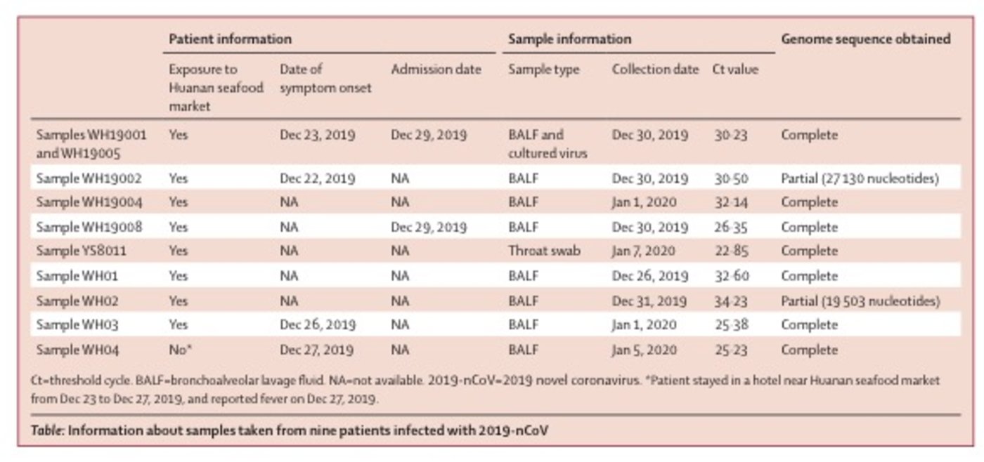 在第一篇研究报告中,科学家从9名被确诊为新冠肺炎患者的支气管肺泡灌洗液与培养物中分离出了样本,进行基因测序和遗传分析工作。从这些样本中,科学家们一共拼接出了8个完整的病毒基因组,以及2个部分完整的病毒基因组,通过对这九名患者的新型冠状病毒(2019-nCoV)的10个基因组序列进行了新的遗传分析,以确定病毒的起源以及病毒的传染途径。