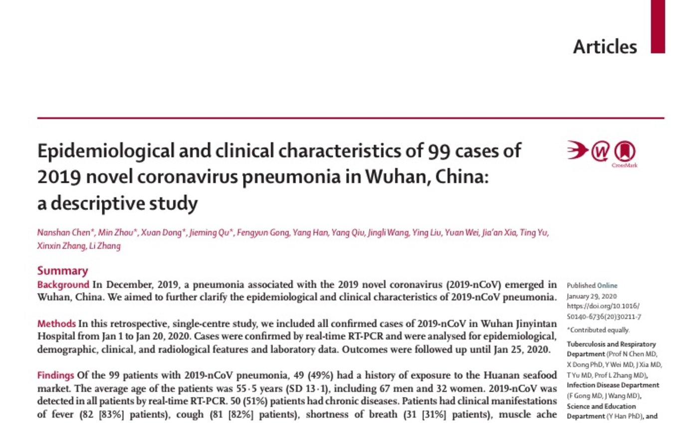 本周,钛媒体曾报道(《柳叶刀》曝疫源地或非华南海鲜市场,新冠肺炎再添疑云),分析 41例武汉早期确诊感染的病例,而这一次《柳叶刀》上发布的最新论文,是对上一次数据报告的补充,通过对 99 例经实验室去人的新型冠状病毒感染的确诊病例,进行数据研究和分析,科研团队扩大了病例样本数,患者的临床表征愈发明显。
