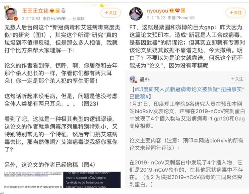 同时,浙江大学生物科学研究院教授王立铭也在微博上驳斥该结论,称这几个片段是病毒序列中特别小、特别常见的特征,将这些常见的特征和艾滋病毒相比,当然会得出二者相似的结论。他打了个比方,“你居然和去年的杀人犯长得一样,都有两只耳朵,你一定是杀人犯的孪生哥哥”,但事实是全人类都有两只耳朵。王立铭称这是典型的逻辑谬误。
