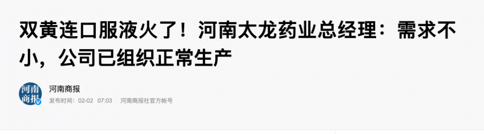 “双黄连口服液”火爆背后,也有望在资本市场引发概念股炒作。作为双黄连主要生产企业之一的太龙药业,或“首当其冲”。2月2日,该公司总经理公开对媒体称,市场对双黄连口服液的需求不小,公司已组织正常生产。