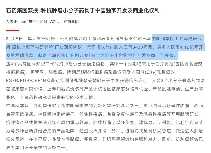 或许是巧合,在石药集团投资海和生物1个月后,石药集团即获得中科院上海药物所4种候选药物中国独家开发授权,石药集团将以首付款3430万元、最多4.12亿元开发里程碑付款,其中3种候选药物处于临床前研究阶段。