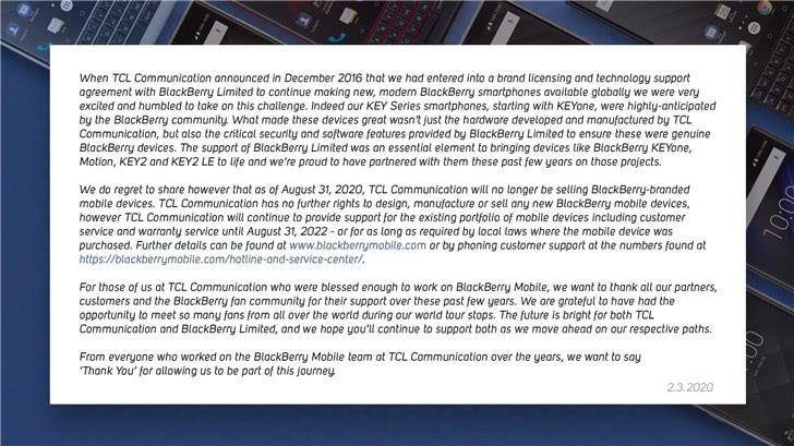 BlackBerry Mobile在公告中称,“我们很遗憾地告诉大家,从2020年8月31日起,TCL通信将不再销售黑莓品牌的移动设备。届时,TCL通信将无权设计、制造或销售任何新的黑莓移动设备。”