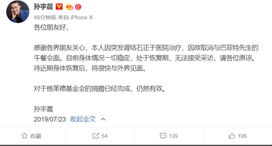 商业 突发!孙宇晨:因身体不适取消与巴菲特午餐会面 2019-07-23 08:49:13 分享 来源:网易财经23日孙宇晨在微博表示,因突发肾结石正于医院治疗,因故取消与巴菲特先生的午餐会面。目前身体情况一切稳定,处于恢复期。孙宇晨还表示,对于格莱德基金会的捐赠已经完成,仍然有效。午餐原定于7月25日在旧金山硅谷举行。格莱德基金会位于美国西部城市旧金山,股神沃伦·巴菲特(Warren Buffett)自2000年起每年拍卖一次与他共享午餐机会,把拍卖收入捐给美国慈善机构格莱德基金会(Glide Foundation),用于帮助旧金山地区穷人和无家可归者。