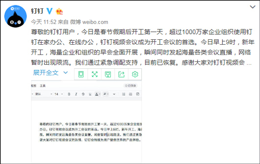 事件发生后,钉钉在官方微博表示:“今日是春节假期后开工第一天,超过1000万家企业组织使用钉钉在家办公、在线办公,钉钉视频会议成为开工会议的首选。今日早上9时,新年开工,海量企业和组织的早会全面开展,瞬间同时发起海量各类会议直播,网络暂时出现限流。我们通过紧急调配支持,目前已恢复。”