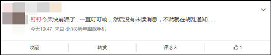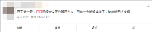 今天上午,有网友在微博上反应,“钉钉视频会议服务器压力大,用着一会就都掉线了,接着就无法发起...”、“钉钉今天快崩溃了...一直叮叮响,然后没有未读消息,不然就在胡乱通知......”。