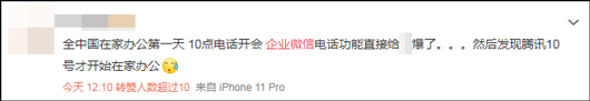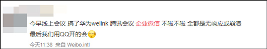 还有网友称“全中国在家办公第一天10点电话开会,企业微信电话功能直接给X爆了...”、“搞了华为welink、腾讯会议、企业微信,不啦不啦,全都是无响应或崩溃”。