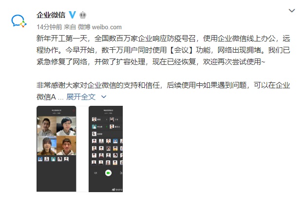 新年开工第一天,全国数百万家企业响应防疫号召,使用企业微信线上办公,远程协作。今早开始,数千万用户同时使用【会议】功能,网络出现拥堵。我们已紧急修复了网络,并做了扩容处理,现在已经恢复,欢迎再次尝试使用~