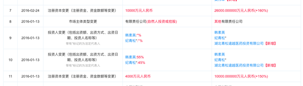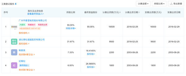 除香雪制药持股55%外,湖北天济另有3家股东。企查查显示,湖北青松逾越医药有限公司(简称“青松逾越”)认缴湖北天济9500万元出资,持股比例31.67%。自然人韩素英和纪某松分别持股7.33%和6%。
