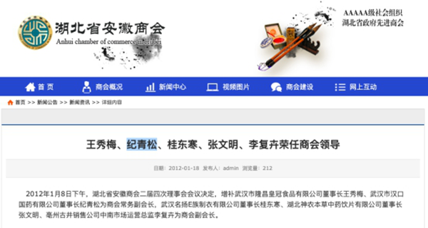 《炣燃科技》查询发现,湖北省安徽商会官网2012年的一篇资讯显示,武汉市汉口国药有限公司董事长纪某松担任该商会常务副会长。