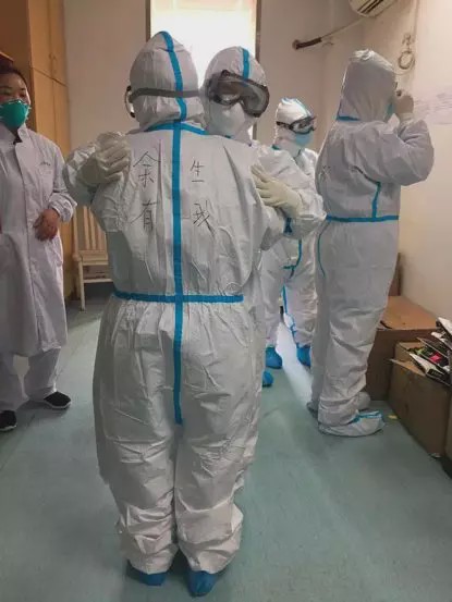 说到穿防护服,我有一个切身的感受可以分享。我原来在上饶单位的病房上班是不用穿防护服的,你要穿过就知道了,它的材质是不透气、不渗漏,空气和液体都透不过,这样才能防止病毒传播。加上我自身也比较胖,特别容易出汗,基本上穿上身一个小时衣物就全部湿透了,相当难受,皮肤泡得像发白的“肉皮”(上饶家乡的一种油炸猪皮),甚至连防雾眼镜都在起雾。但你又不可能才一个小时就换一套。