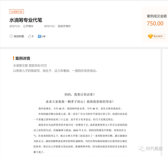 之前曾有媒体报道,不仅假病历可以通过水滴筹平台的审核,甚至众筹文案也可以由淘宝上的个人商家代笔。而且,发起人通过扫描代笔者提供的二维码,可以跳转到水滴筹微信平台发起众筹。