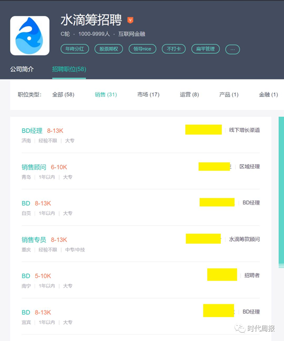 水滴筹在招职位以销售类及推广类岗位为主