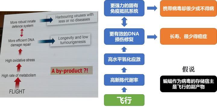 用通俗一点的语言解释:因为在进化上,蝙蝠选择了飞行,所以它的代谢率会升高,这样氧化应激水平也会升高,为了对抗飞行带来的这些结果,蝙蝠进化上适应了高水平的DNA损伤修复,这一点的直接后果是蝙蝠的寿命很长,并且很少发生癌症;此外蝙蝠具有了更强的本底水平的固有免疫应答系统,所以携带病毒的时候很少发病或就是不发病。