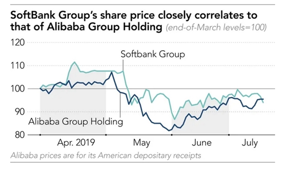 阿里巴巴的股价走势与软银股价密切相关。