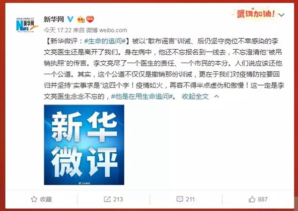 新华网微评说:李文亮尽了一个医生的责任、一个市民的本分。人们说应该还他一个公道。其实,这个公道不仅仅是撤销那份训诫,更在于我们对疫情防控要回归并坚持“实事求是”这四个字!