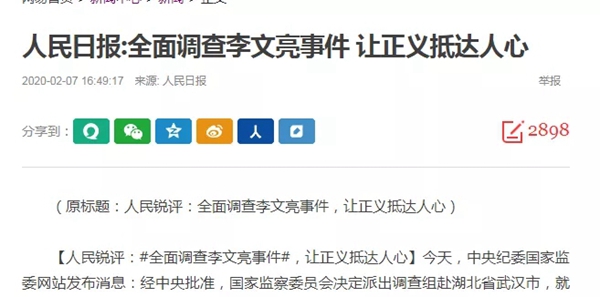 人民日报旗下《环球时报》刊登其总编辑胡锡进的文章:武汉市的确欠对李文亮的一个道歉。武汉和湖北的主官们也欠对湖北和全国人民的一个郑重道歉。武汉市的主要官员为什么不在李文亮病重期间去慰问他,为什么不早一些推翻之前对他的态度?我们的一方政府和官员们做错了事情,向受了冤屈的人道个歉鞠个躬,难道就这么难吗?