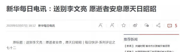 新华社《新华每日电讯》今天刊登评论员文章《别李文亮 愿逝者安息愿天日昭昭》说:毫无疑问,李文亮是一个医德高尚的医生。人们遗憾其不幸离世,不仅在于这世上少了一个妙术仁心的优秀医生,更在于他率先向身边人发出疫情预警信息。