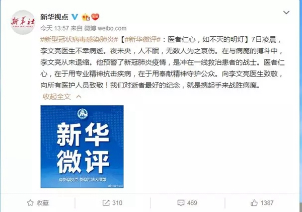 新华社《新华视点》说:7日凌晨,李文亮医生不幸病逝。夜未央,人不眠,无数人为之哀伤。在与病魔的搏斗中,李文亮从未退缩。他预警了新冠肺炎疫情,是冲在一线救治患者的战士。医者仁心,在于用专业精神抗击疾病,在于用奉献精神守护公众。向李文亮医生致敬,向所有医护人员致敬!