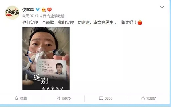 炣燃科技2月7日讯 北京时间2020年2月7日凌晨2点58分,被称为武汉疫情“吹哨人”的李文亮医生去世。
