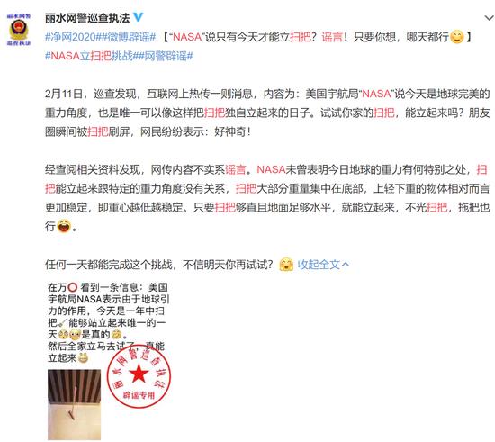 2月11日消息,今日网上热传一条消息,内容为美国宇航局“NASA”说今天是地球完美的重力角度,也是唯一可以像这样把扫把立起来的日子。对此,丽水网警通过微博辟谣,称经查阅相关资料发现,网传内容不实系谣言。