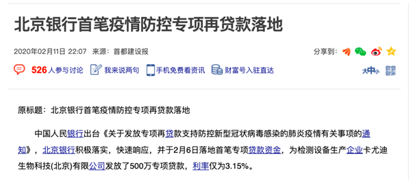 事实上,北京地区的首笔抗疫情专项贷款即发放给了抗疫情医疗检测企业。根据《首都建设报》2月11日的报道,北京地方银行北京银行首笔疫情防控专项再贷款落地,拥有免核酸提取RNA快检平台技术卡尤迪生物科技(北京)有限公司获得500万元贷款。