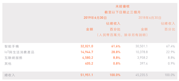 小米集团的主营业务收入构成 来源:小米集团2019半年报