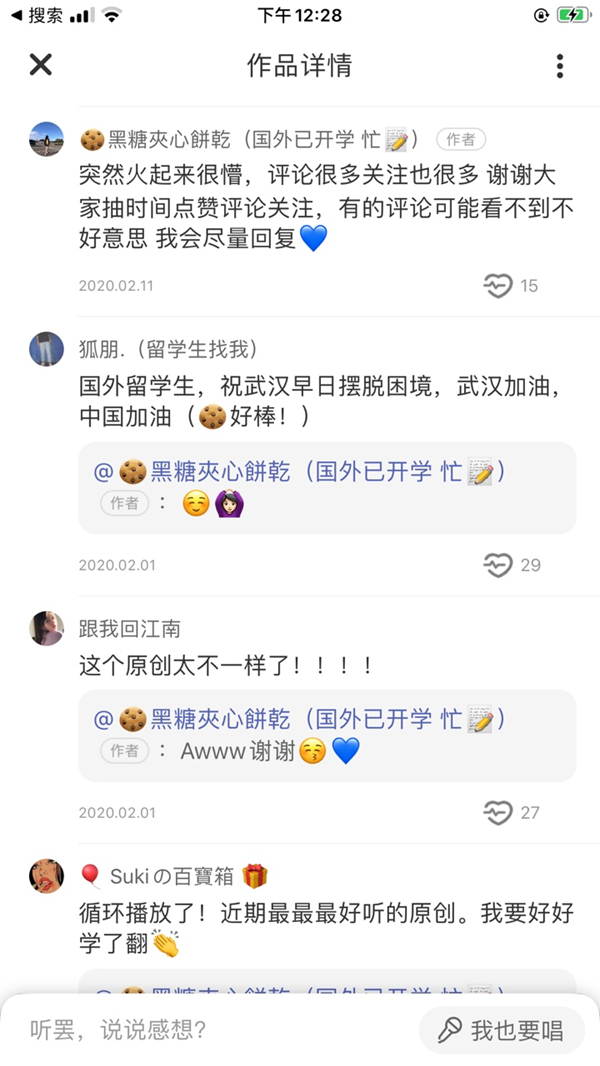 在唱鸭中,原创歌曲大多都是1分钟以内的短歌曲,适合音乐爱好者进行创作。饼干平时课业任务重,没有太多娱乐时间。但爱唱歌的她却特别喜欢在唱鸭里跟国内的伙伴互动,“在这里不仅能唱歌,听歌,也能交到很多志同道合的朋友。” 这对于在异国他乡读书的她来说,非常珍贵。