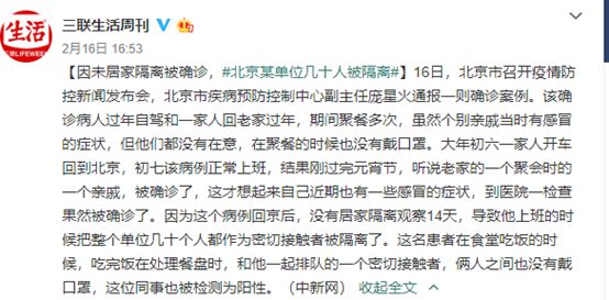 16日北京市疫情防控新闻发布会消息,北京市一确诊病例返京后直接上班,此前未进行居家隔离,导致几十人被隔离,并且有一位同事因为与该病例在食堂处理餐盘一同排队时,两人都没有佩戴口罩,也被检测为阳。
