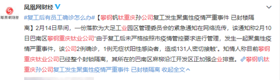 重庆某公司由于复工后未严格按照市疫情管控要求进行管理,发生一起聚集性疫情,截止2月10日该公司2例确诊,1例无症状阳性感染者,造成131人密切接触,导致公司被整个封锁隔离。