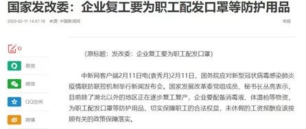 国家也要求企业复工后要为职工配发口罩等防护用品。