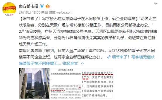 据报道,广州天河区发现两例新冠肺炎“无症状感染者”,关系为母子。该母子此前已复工上班,办公地点在同一大厦的不同楼层,目前两家企业都已停止办公,进行隔离。