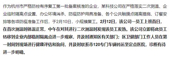 杭州市某公司于2月10日进行小规模复工,2月12日一员工首日上班,在首次测温时体温正常,中午在对其进行二次测温时发热,目前该企业已经暂停复工,进行再排查、再消毒、再落实。