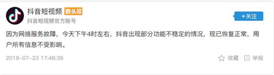 商业 抖音回应登录异常:网络故障,已恢复 2019-07-24 08:49:08 分享 来源:IT之家据抖音官方消息,因为网络服务故障,今天下午 4 时左右,抖音出现部分功能不稳定的情况,现已恢复正常,用户所有信息不受影响。近日字节跳动方面公布了旗下产品的运营数据。数据显示,截至 2019 年 7 月,字节跳动旗下产品全球总日活跃用户量超过 7 亿,总月活跃用户超过 15 亿,其中抖音日活跃用户量超过 3. 2 亿。