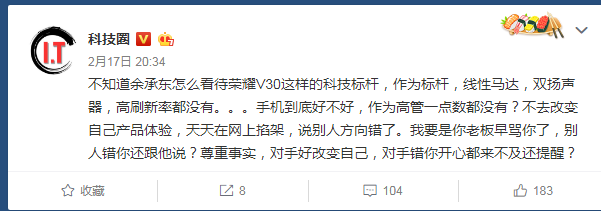 荣耀V30全新亮相消息传出后,立即成为社交媒体的焦点,不少消费者表示很期待。不过行业大V表示质疑,拥有百万粉丝的科技圈说:不知道余承东怎么看待荣耀V30这样的科技标杆,作为标杆,线性马达,双扬声器,高刷新率都没有。
