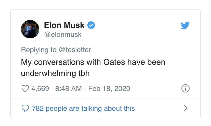 一名特斯拉粉丝发贴表示对盖茨决定买保时捷Taycan而不是特斯拉感到失望,对盖茨发表的关于电动汽车里程焦虑(range anxiety)的评论更不感冒。马斯克回复道:“和盖茨说话一直让我感到没劲。”