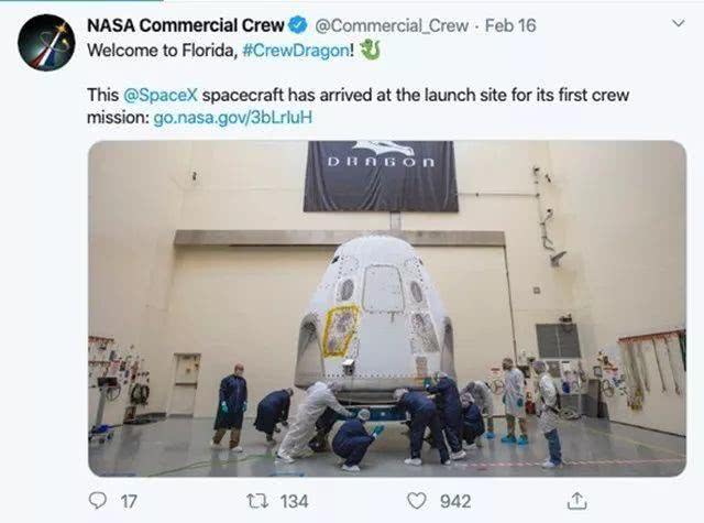 此前,SpaceX 运送宇航员的龙飞船已经制作完成,并已运往美国东部佛罗里达,于 2 月 13 日周四抵达 SpaceX 在佛罗里达的基地。