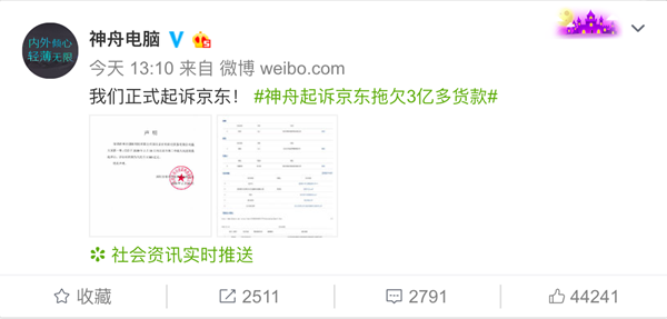 今天下午13:10分,微博认证账号@神舟电脑发布消息称,因京东拖欠3亿多元货款,已正式起诉京东。