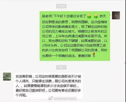 不过,也有员工反感,公司管理层和人事部门利用“与公司共渡难关”的理由来强制降薪。毕竟,管理层同普通员工比起来,承受风险的能力区别很大,不能一概而论。一则员工与人事部门关对话引发激烈讨论,“公司这时候需要那些不计个人得失,只拿生活费,跟公司共渡难关的人”。