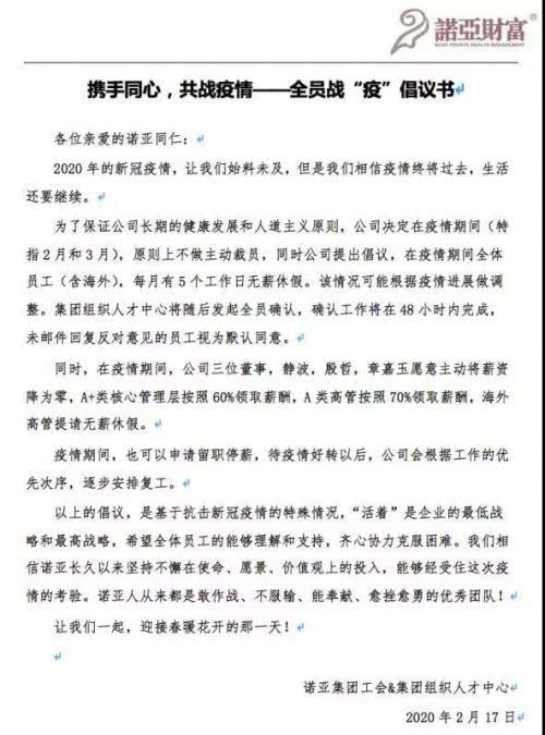 诺亚财富通知全体员工:为了保证公司长期健康发展和人道主义原则,公司决定在疫情期间(特指2月和3月),原则上不因疫情做主动裁员。同时,公司提出倡议,在疫情期间所有员工(含海外),每月有5个工作日无薪休假。员工可以申请留职停薪,公司会在疫情好转后再逐步安排复工。