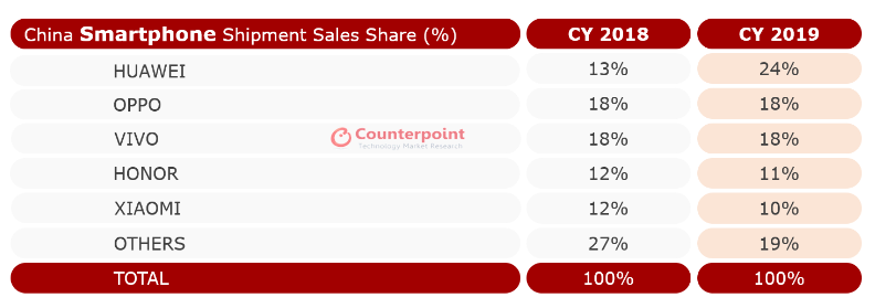 除了华为外,OPPO和vivo排名紧随其后,不过两者市场份额相比去年并没有任何增长,都是18%。前五名中还有荣耀和小米,两者对应的市场份额分别是11%和10%,其中小米去年在中国市场份额相比2018年下滑了2%。